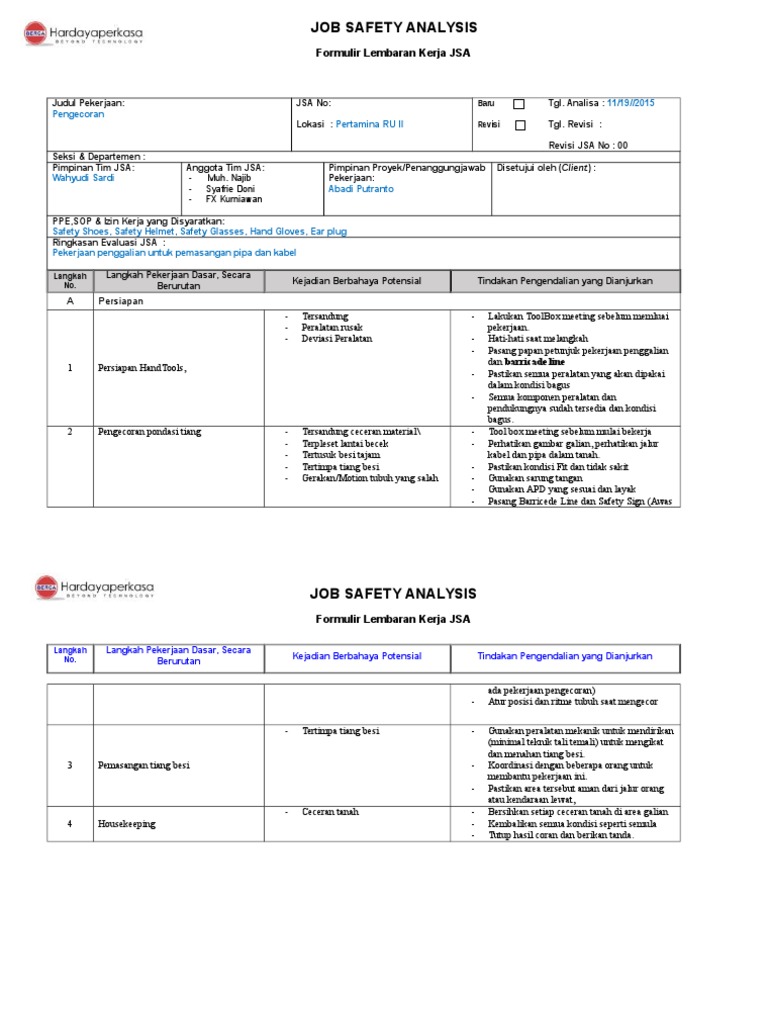 Job Safety Analysis And Risk Assessment Nomor Work Permit Tanggal