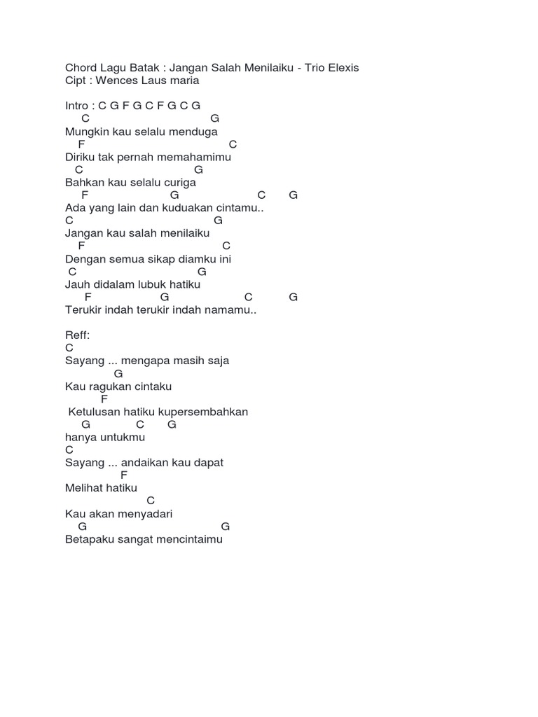 Jangan kau salah menilaiku dengan semua sikap diamku ini jauh didalam lubuk hatiku terukir indah terukir indah namamu reff. C kau akan menyadari g c betapa ku sangat mencintaimu intro c g f g c f g c g c g jangan kau salah menilaiku f dengan semua sikap c diamku ini c g jauh di dalam lubuk hatiku f terukir indah. Kumpulan lirik lagu batak terlengkap dan terupdate.