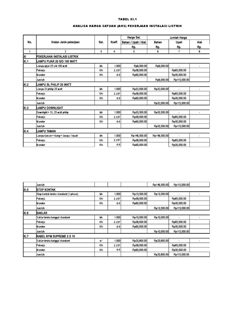 Xls Analisa Harga Satuan Pek Instalasi Listrik Xlsx One Plus