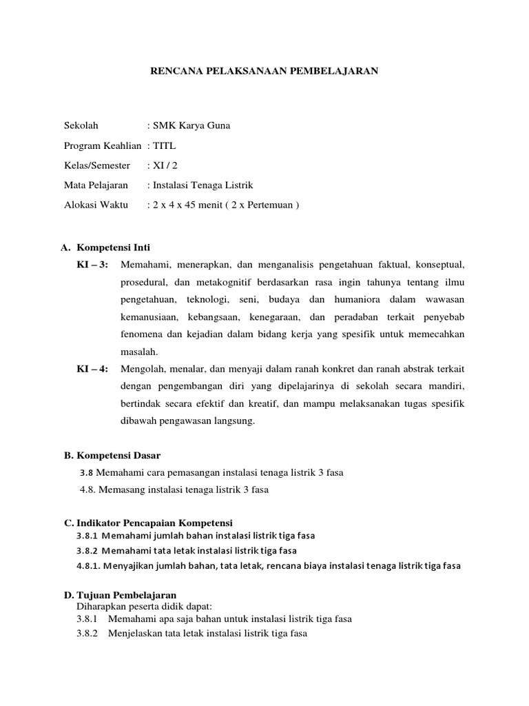 Silabus Mata Pelajaran Instalasi Tenaga Listrik Rev Kelas Xi
