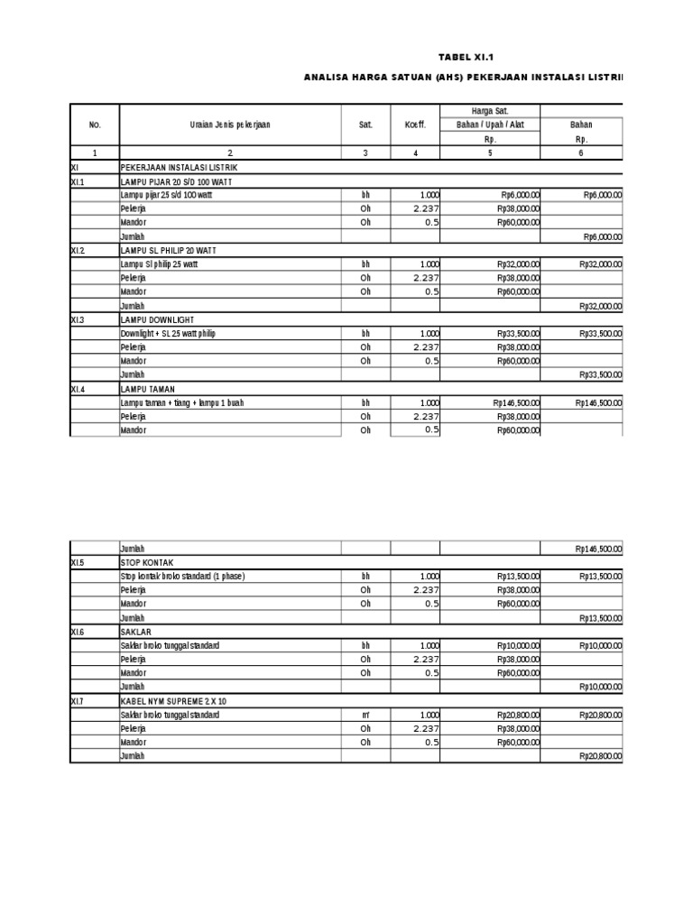 Xls Analisa Harga Satuan Pek Instalasi Listrik Xlsx One Plus
