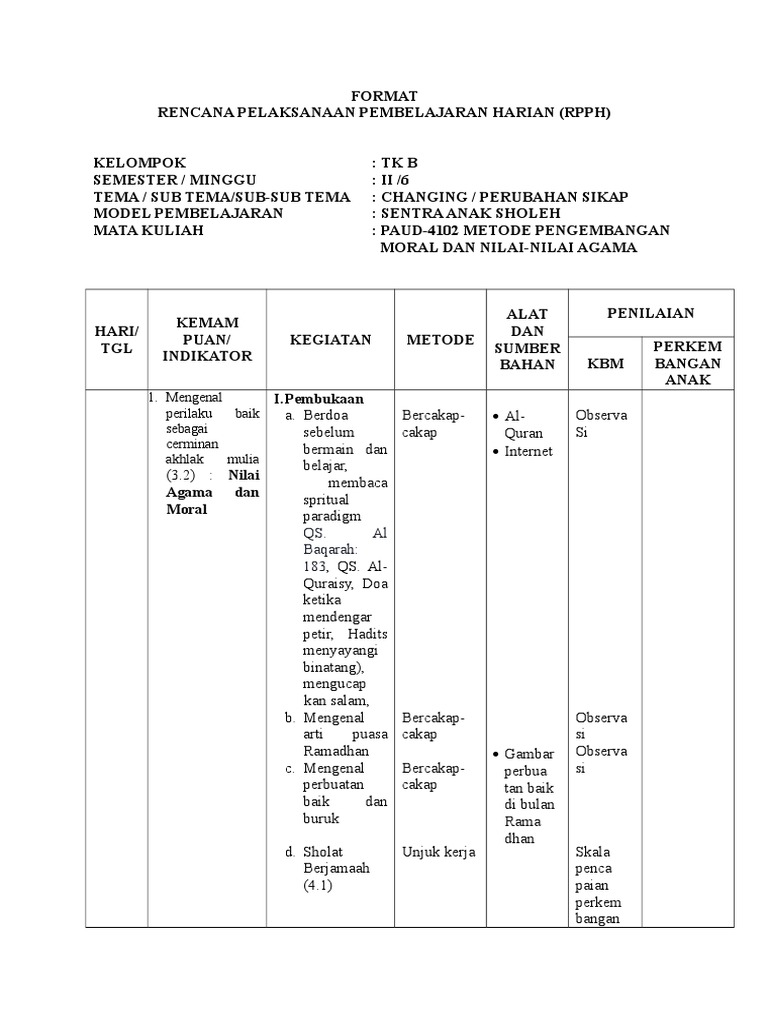 Contoh Rpph Tk Ra Kelas B Semester 1 Dan 2 Kurikulum 2013 Berkas