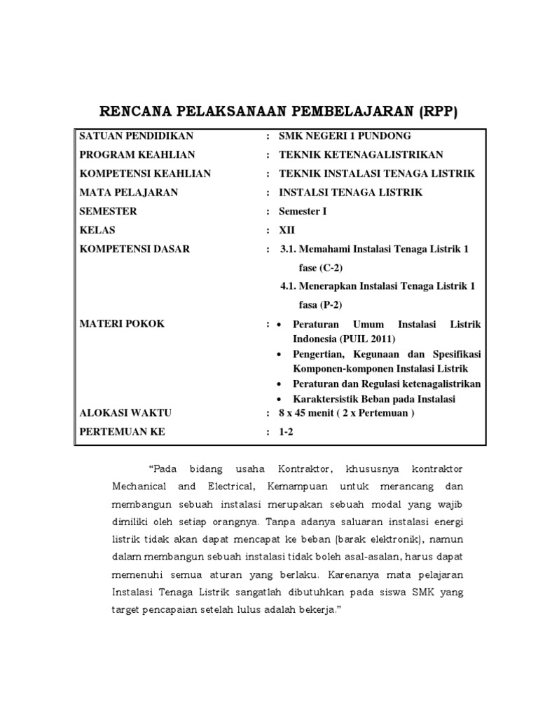 Rpp Instalasi Tenaga Listrik Itl Kelas Xi Teknik Instalasi Tenaga
