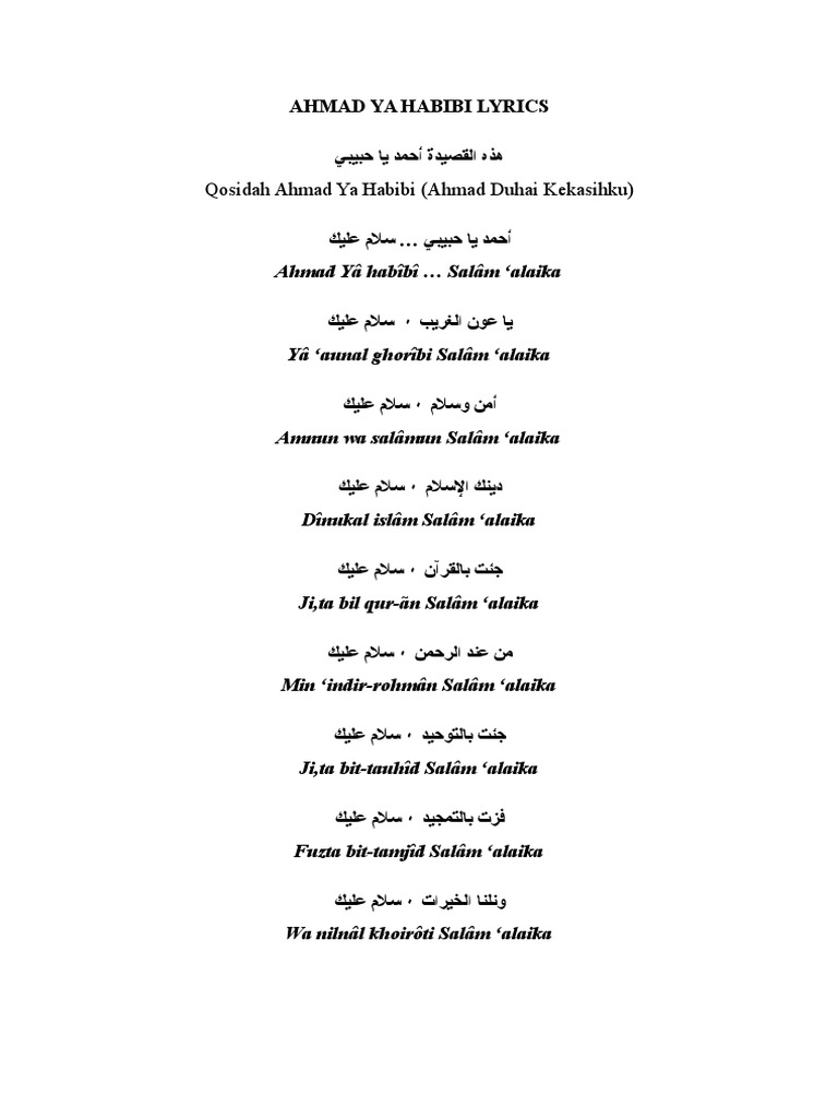 Tulisan arab teks latin lirik dan terjemahannya lengkapnya baca disini. Ahmad ya habibi. Selawat ini semakin populer usai di cover sabyan gambus dan diunggah ke youtube pada agustus 2017 lalu.