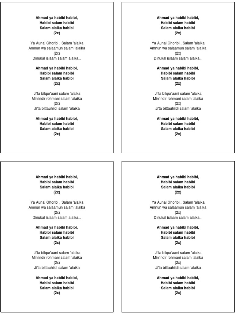 Lirik lagu ahmad ya habibi. Lirik ahmad ya habibi download gratis lagu mp3 sholawat baca teks syair qasidah lirik ahmad ya habibi terlengkap dan terbaru di sholawatku. Lirik lagu ahmad ya habibi dinyanyikan oleh nissa sabyan gambusini merupakan salah satu lagu solawat yang sedang populer di indonesia. Lirik ahmad ya habibi versi terbaru ahmad ya habibi habibi habibi salam habibi salam alaika habibi ahmad ya habibi habibi habibi salam habibi salam alaika habibi ya aunal ghoribi salam alaika amnun wa salaamun salam alaika ya aunal ghoribi salam alaika.