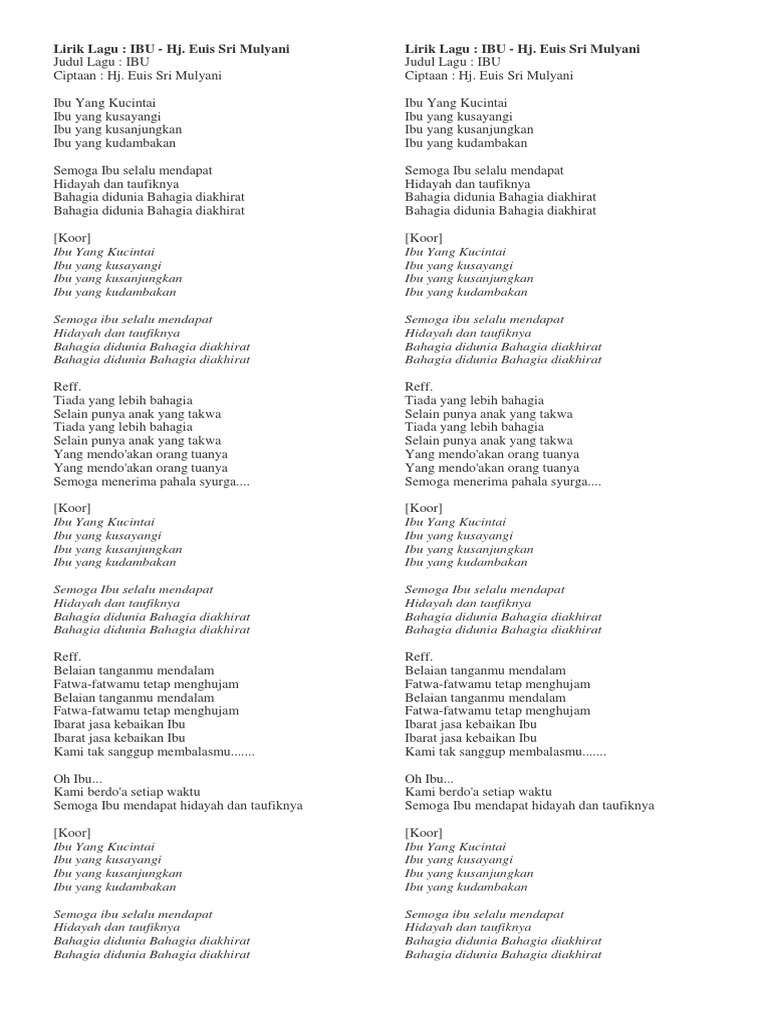 Berikut cuplikan syair nyanyian teks lagunya terima kasihku takkan pernah terhenti sinari hidupku dengan kehangatanmu bagaikan embun kau sejukkan hati ini dengan kasih sayangmu pengorbananmu sungguh sangat. Aku sedih membaca lirik liriknyakarena org tua sy udah dluan di pagil oleh yg maha kuasaaku terharu bahwa seorang ibu butuh perjuangan demi anaknyasy doakan semoga amal ibadahnya di terima. Kumpulan lirik lagu qasidah.