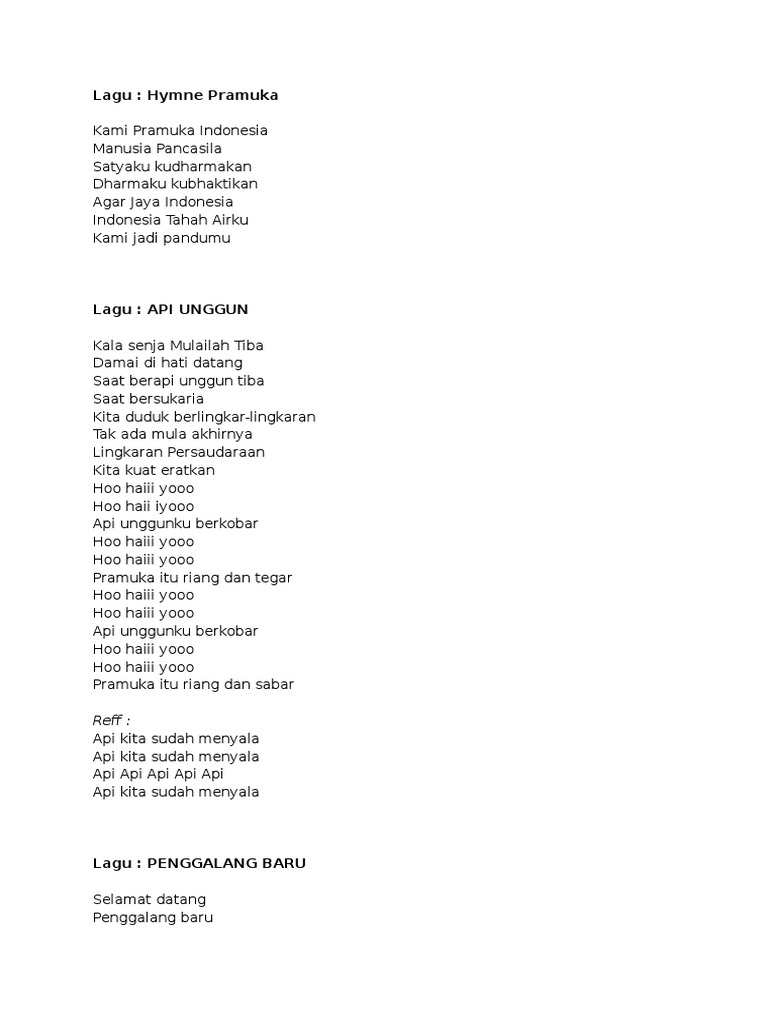 Artikel atau bagian artikel. Satyakukudharmakan dharmakukubaktikan agar jaya indonesia indonesia tanah airku kami jadi pandumu templatkepanduan complete. Hymne pramuka lirik lagu wajib nasional ciptaan h mutahar duration.