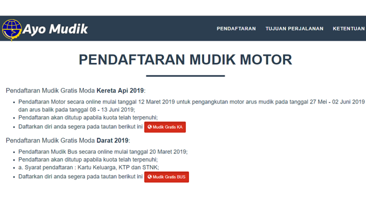 Pendaftaran motor secara online mulai tanggal 12 maret 2019 untuk pengangkutan motor arus mudik pada tanggal 27 mei 02 juni 2019 dan arus balik pada tanggal 08 13 juni 2019.