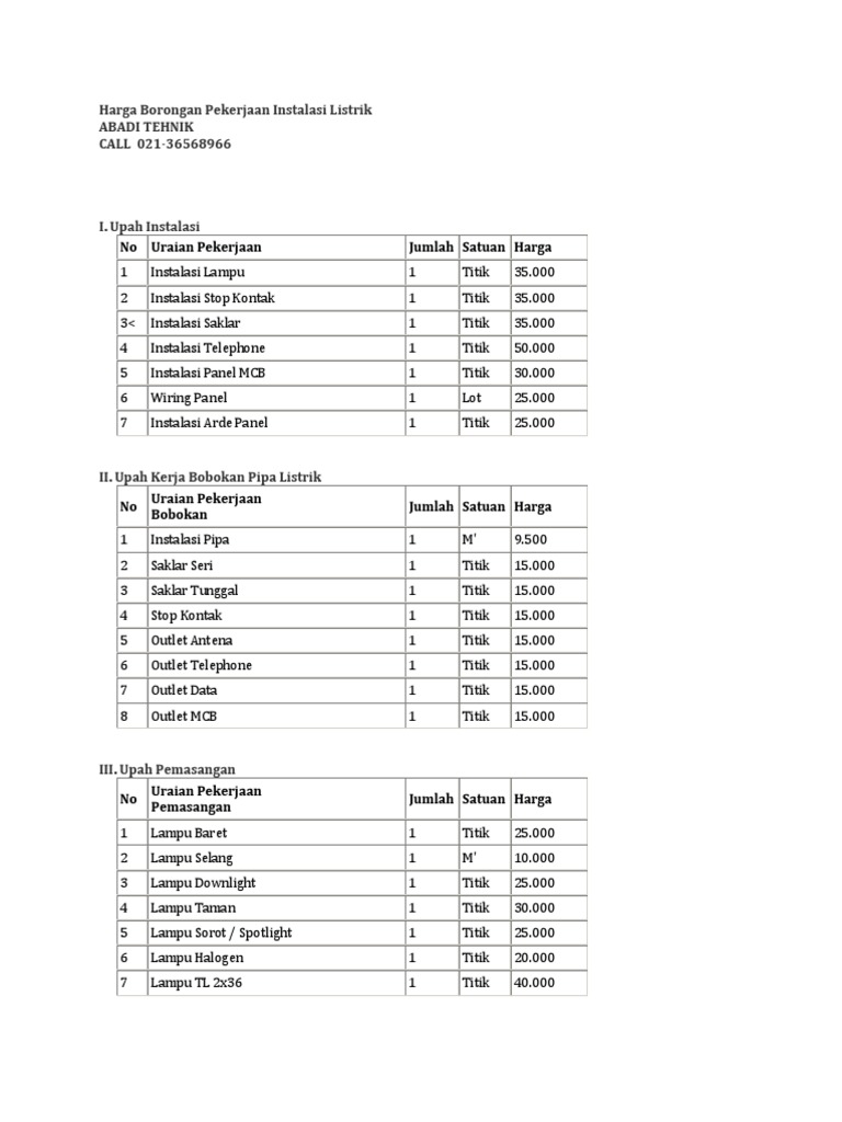 Harga Borongan Pekerjaan Instalasi Listrik