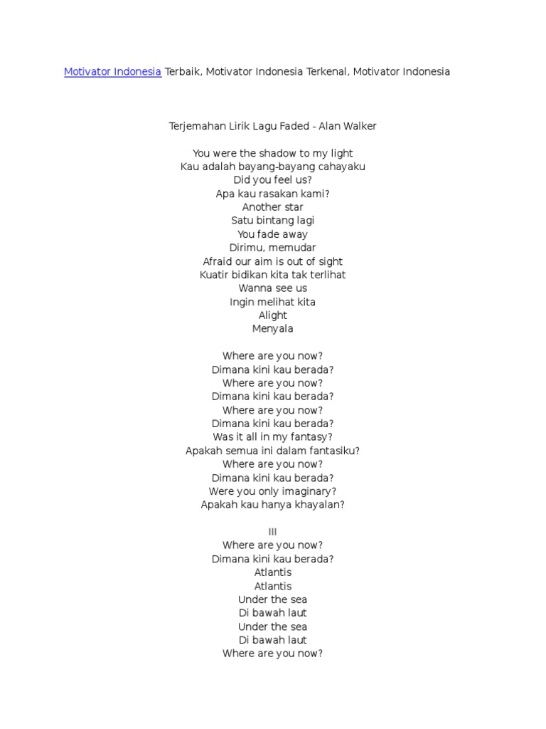 Lirik Terjemahan Indonesia Lagu Alan Walker Faded