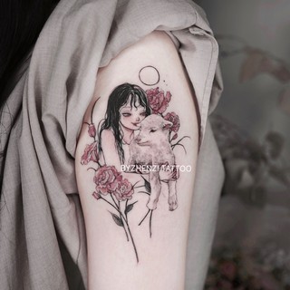 The tattoo has a girl who appears to stand on the flowers as she flicks her hair around. The tattoo nicely fit on the thighs with the girl seated on the flower and holding her hair.